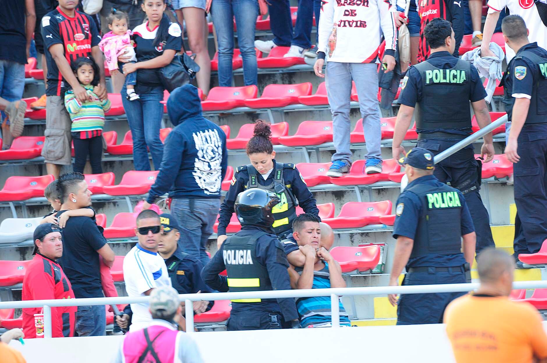 La Fuerza Pública detuvo a 53 personas que participaron en los disturbios protagonizados por la barra organizada "La 12" en el partido de este domingo entre Cartaginés y Alajuelense, en el Estadio Nacional.