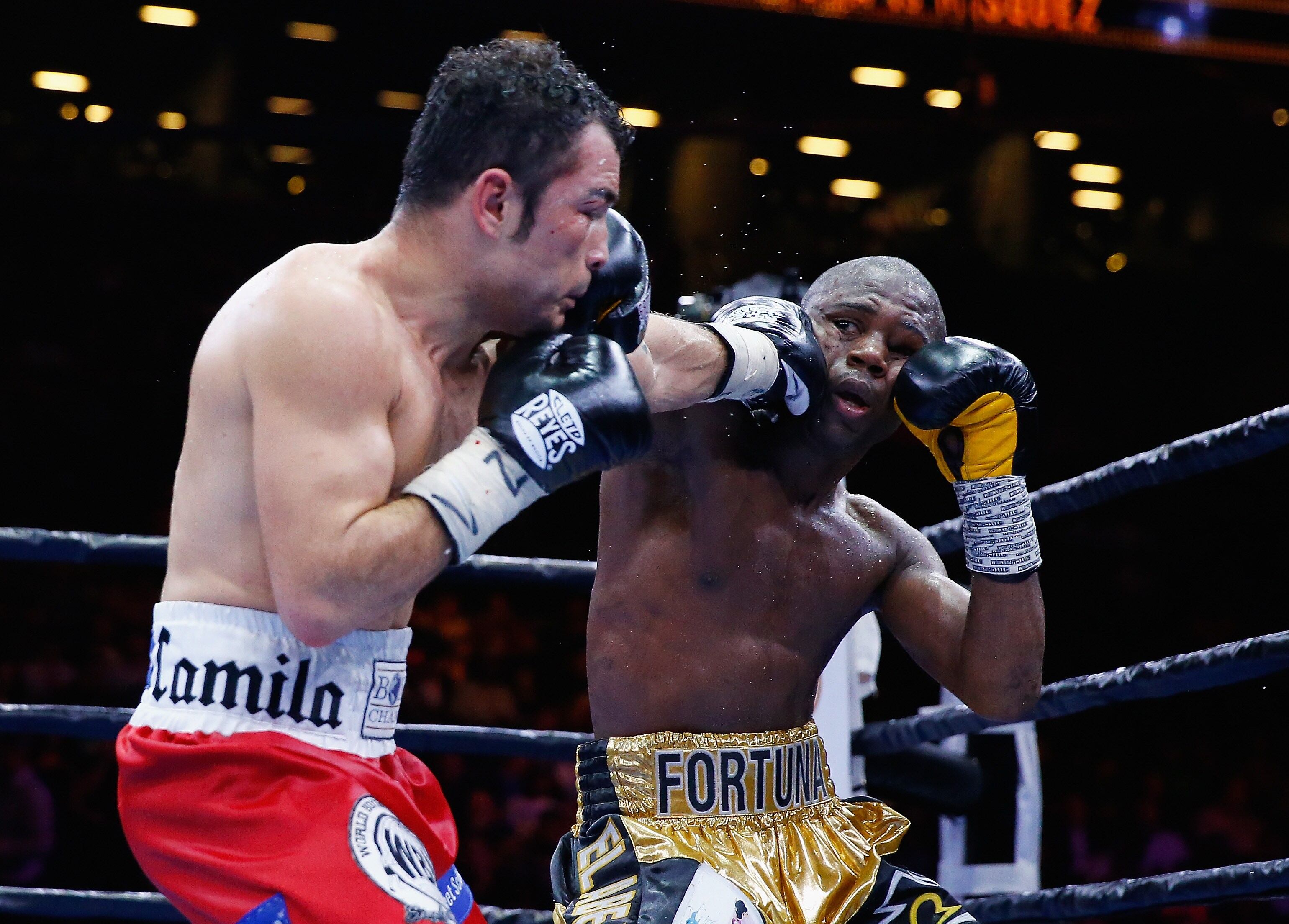 Bryan Vásquez y Javier Fortuna intercambian golpes durante la pelea que tuvieron este viernes. (AFP)