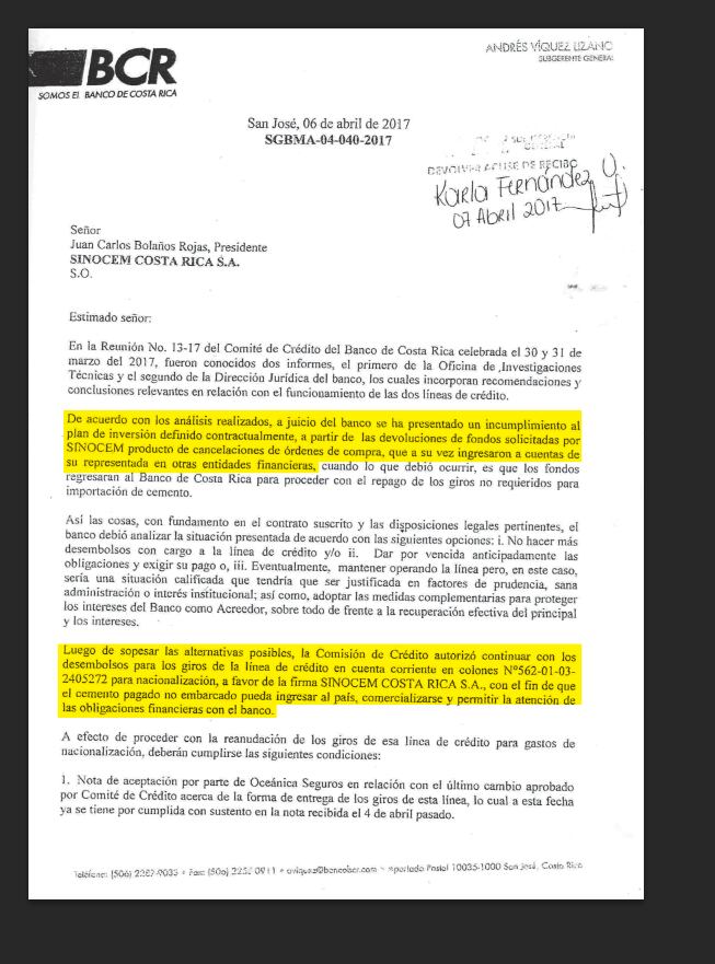"Luego de sopesar las alternativas posibles, la Comisión de Crédito autorizó continuar con los desembolsos (...) con el fin de que el cemento pagado no embarcado pueda ingresar al país, comercializarse y permitir las obligaciones financieras con el Banco", sostuvo Víquez en la carta enviada a Juan Carlos Bolaños.
