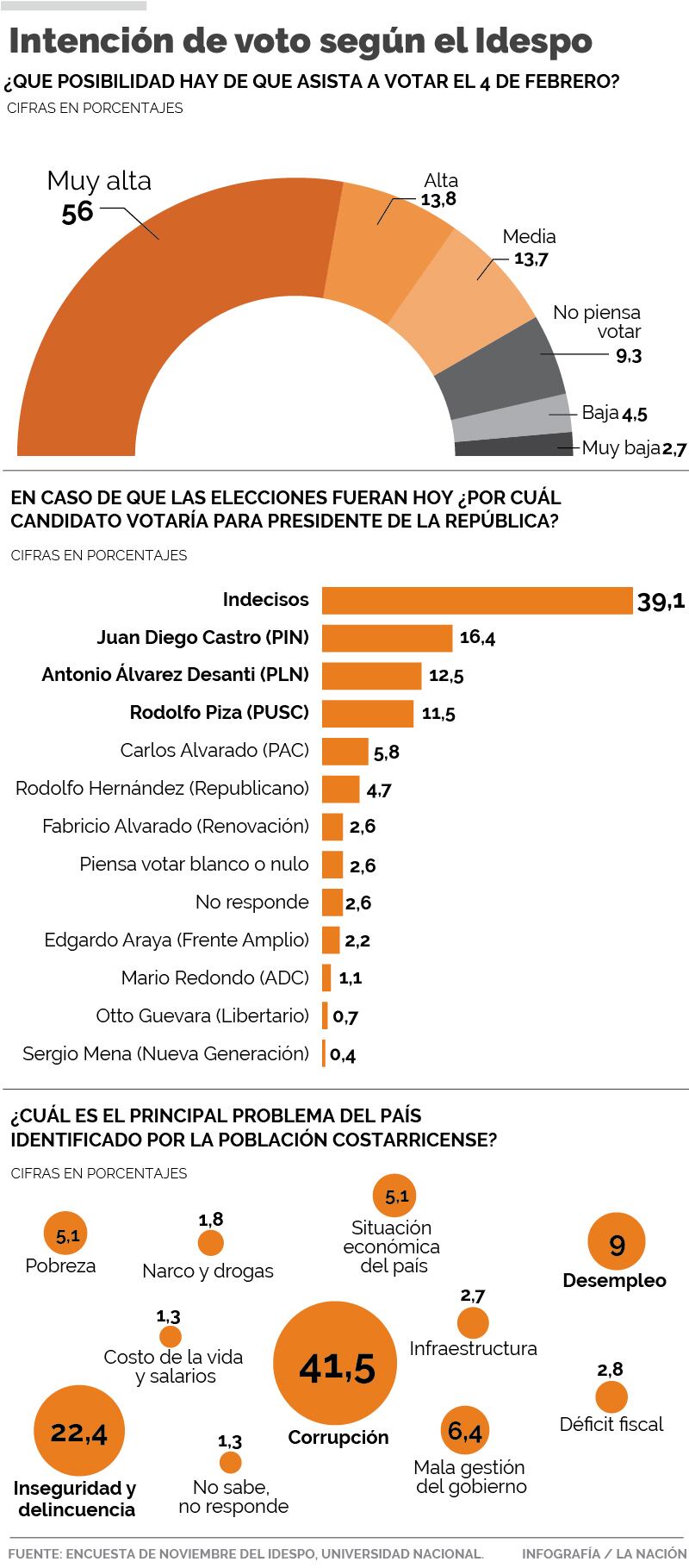 Una encuesta del Instituto de Estudios Sociales en Población (Idespo), de la Universidad Nacional (UNA), mostró un empate técnico entre los candidatos Juan Diego Castro, Antonio Álvarez Desanti y Rodolfo Piza rumbo a las elecciones presidenciales del 4 de febrero.
