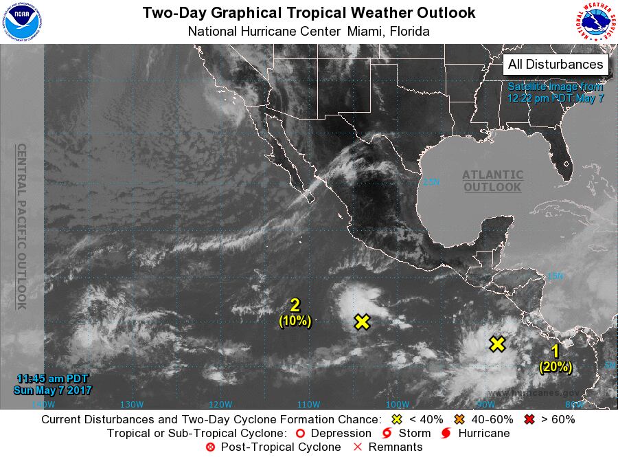 El Centro Nacional de Huracanes de Estados Unidos actualizó en su página que en los próximos dos días hay posibilidades entre un 10% y un 20% de que se desarrollen dos sistemas de baja presión frente a la costa pacífica del istmo centroamericano.