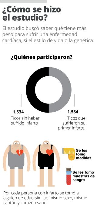 Genes versus hábitos. En el estudio que arrojó estos resultados, participaron 1.534 ticos que habían tenido su primer infarto. Además, por cada uno de ellos, se escogió a una persona que no hubiera sufrido males cardíacos y que tuviera una edad similar, el mismo sexo y viviera en el mismo cantón.