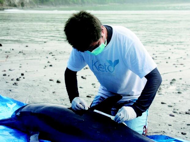 El biólogo José David Palacios toma las medidas a un delfín que encalló. | FUNDACIÓN KETO PARA LN.