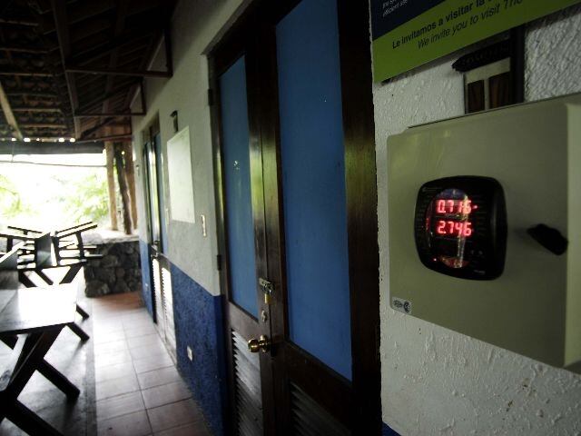 Este sistema consiste en 20 medidores –cinco de ellos visibles– los cuales realizan un monitoreo en tiempo real del consumo eléctrico en diferentes puntos dentro de las instalaciones del INBio, como la Estación Biológica, la Casa Autosuficiente, el Laboratorio de Bioprospección y el restaurante.