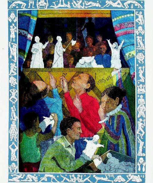 La escena presentada es un pequeño circo de títeres al que asistí muchas veces en mi niñez porque conocía a uno de los hijos de la familia cirquera. Así accedí a la parte posterior del pequeño e improvisado escenario y observé toda la función desde atrás.