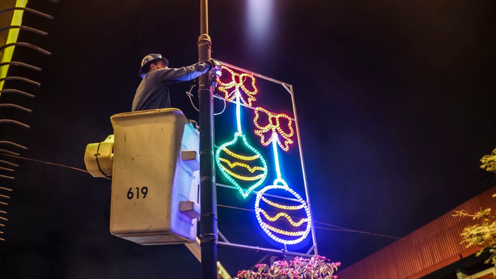 “Ya hay montados cerca 17 adornos al lado este del parque Central. A las cinco palmeras de alrededor les están colocando cascadas de luces de seis metros de largo, color blanco. Después, se realizará la iluminación del quiosco”, señaló José Chavarría, encargado del grupo.