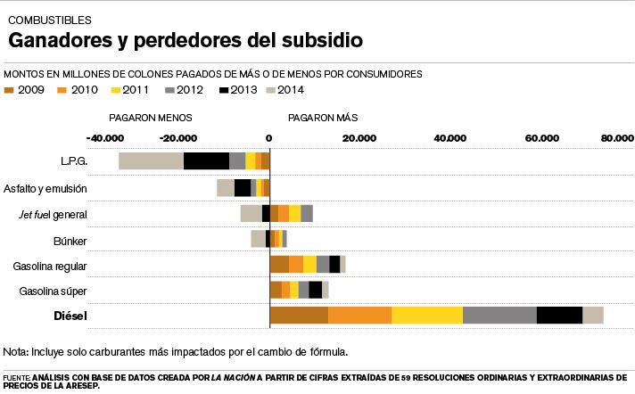 En los últimos seis años, a Recope le costó ¢45 en promedio poner en sus planteles cada litro de diésel, pero el resultado de la operación financiera de la Aresep elevó ese monto a ¢57. Los consumidores pagaron, en promedio, ¢12 más por litro. La media del precio final del diésel (entre 2009 y setiembre anterior), debió ser ¢568 y no de ¢580.
