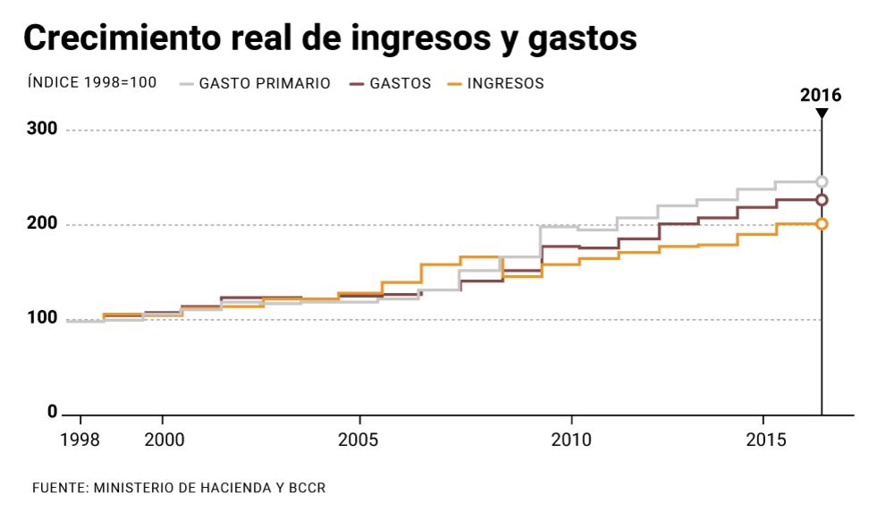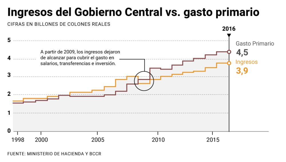 "La insostenibilidad de las finanzas públicas inició en 2009, debido a una política de aumentos en las remuneraciones (salarios y cargas sociales) y las transferencias. El objetivo de esa política era, en principio, contrarrestar los efectos negativos de la crisis económica mundial; sin embargo, al expandir el gasto corriente y no la inversión pública, generó presiones permanentes sobre el déficit primario (gastos menos ingresos, sin incluir el pago de intereses)", señala el XXII informe del Estado de la Nación.