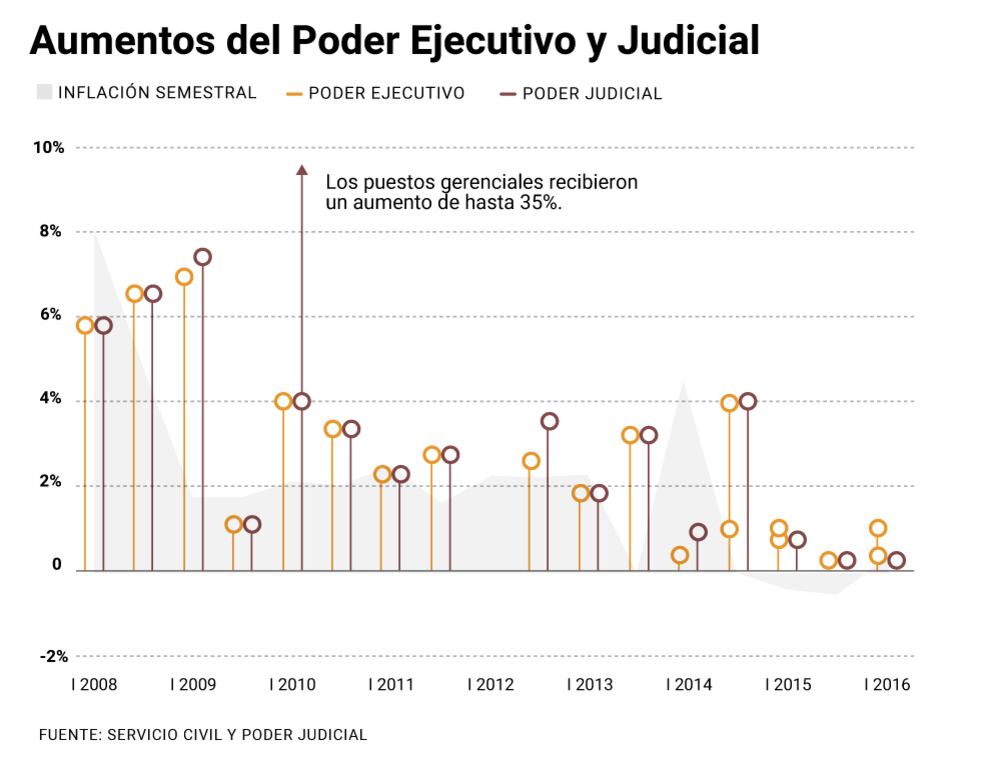 Adicionalmente, en el Poder Judicial, entre el 2008 y el 2010, se aprobaron otra serie de aumentos a los salarios base de ciertos puestos y la creación de incentivos, que dispararon el gasto en remuneraciones. Por ejemplo, en el segundo semestre de 2010, se aprobó un aumento del 35% al salario base de los puestos gerenciales de la institución.