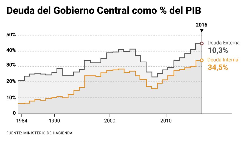 Como los ingresos fiscales no alcanzan, el gobierno ha tenido que recurrir al endeudamiento para financiarse. La deuda del Gobierno Central como porcentaje del Producto Interno Bruto pasó de 32,5% en 1998 a 44,9% en el 2016; el punto más bajo del periodo analizado se dio en el 2008 con 24,1%.