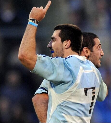 (ARCHIVO) Juan Martín Fernández Lobbe (I) celebra con Ignacio Fernández Lobbe al final del partido ante Esoccia en El Gigante de Arroyito en Rosario el 7 de junio de 2008. Juan Martín Fernández Lobbe | AFP