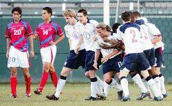 Danny Szetela (17) es felicitado por sus compañeros, al concretar el segundo gol estadounidense. José Garro (20) y José Chan sufren el contraste, que fue definitivo. SENTENCIA. | AP /LA NACIÓN (CHRIS CARLSON)