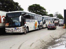 "Salimos hoy (ayer) a las 5 a. m. de San José para evitar el congestionamiento. Traemos cinco buses con 54 personas cada uno", dijo ayer Mónica Eduarte, de Scotian Internacional Turismo, mientras un funcionario de Migración revisaba el transporte en que viajaba.