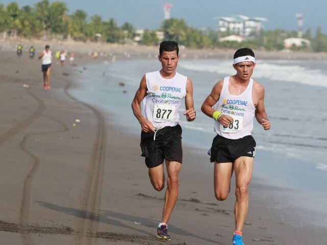 Eliécer Oviedo (derecha) intenta dejar atrás a Leonel Abarca, ayer, en la playa de Puntarenas. | ANEL KENJEKEEVA (Anel Kenjekeeva)