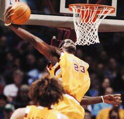La juvenil estrella de los Cavaliers de Cleveland sufrió la quebradura del pómulo izquierdo al recibir un codazo del centro de los Rockets de Houston, Dikembe Mutombo.