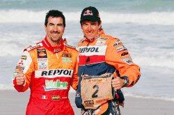 El francés Luc Alphand (izquierda) festeja el triunfo en autos con el ganador de motos, el español Marc Coma. | AFP (DAMIEN MEYER)