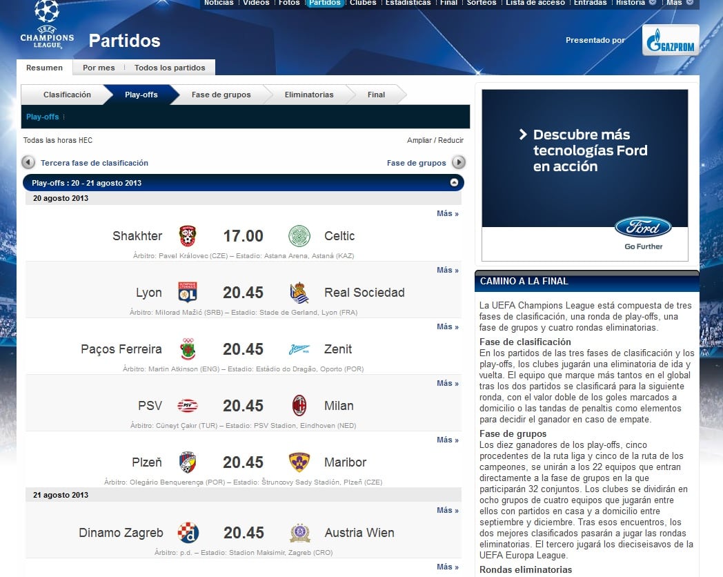 Miércoles. 12:45 p. m.: Dinamo Zagreb (Croacia)-Austria Viena (Austria), Ludogorets (Bulgaria)-Basilea (Suiza), Steaua Bucarest (Rumania)-Legia Varsovia (Polonia), Schalke (Alemania)-PAOK Salónica (Grecia) y Fenerbahçe (Turquía)-Arsenal (Inglaterra).