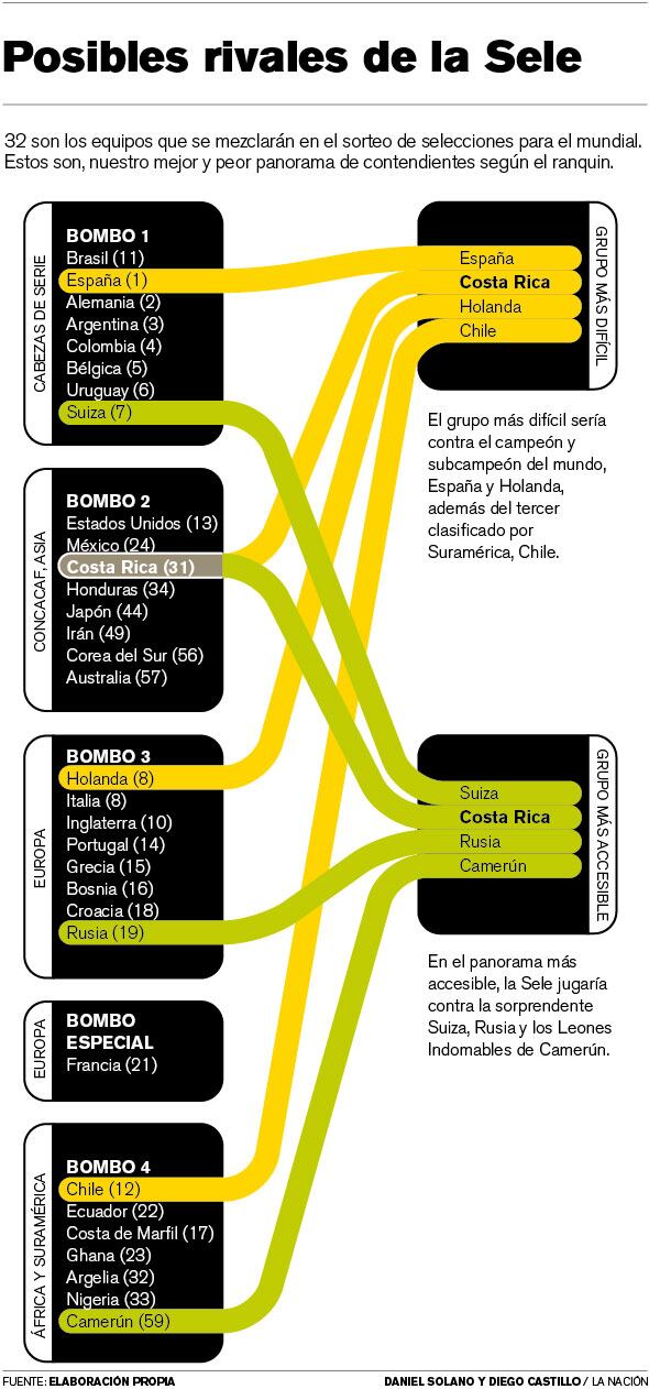 Para la fase inicial del Mundial Brasil 2014, Costa Rica podría quedar ubicada en un grupo con la difícil selección de Chile, junto al campeón y subcampeón del mundo: España y Holanda.