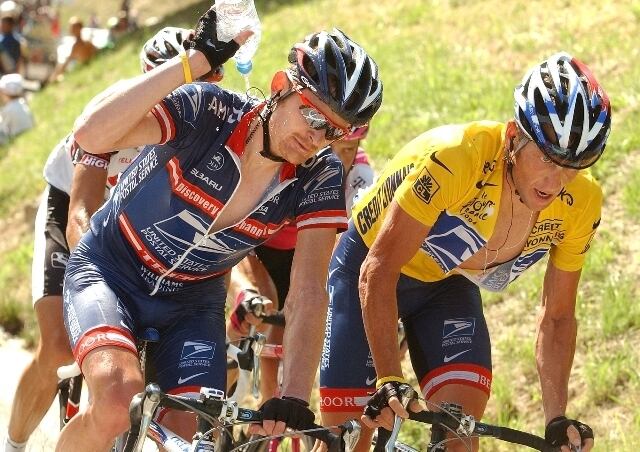 Esta es una foto de Floyd Landis (izquierda) y Lance Armstrong cuando fueron compañeros en el equipo Discovery Channel, en el Tour del 2004. Archi.