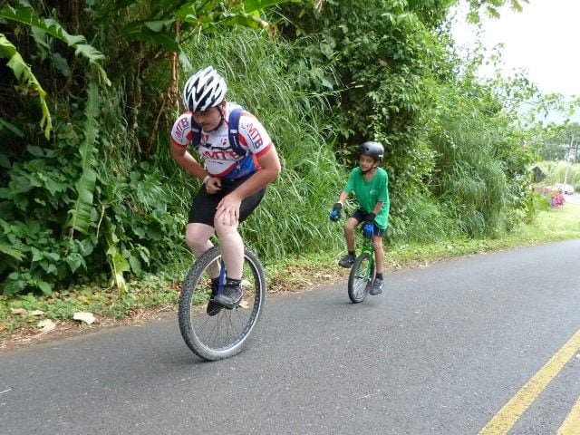 El niño Ricardo Jiménez acompañó al ciclista Luis Alfaro en un pequeño tramo del recorrido al lago de Arenal. Su pericia para pedalear los monociclos llamó la atención en la vuelta de ciclismo recreativo. | CARLOS HERNÁNDEZ.