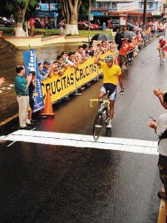 Yelco Gómez ingresa victorioso en la meta. Fue el segundo en la etapa de ayer, pero ganó la Vuelta a San Carlos. | CARLOS HERNÁNDEZ PARA LA NACIÓN