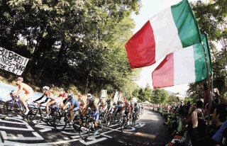 El lote principal pasa junto a estas dos enormes banderas de Italia. La competencia se desarrolló bajo una temperatura de alrededor de 20 grados. | AP (ALESSANDRO TROVATI)
