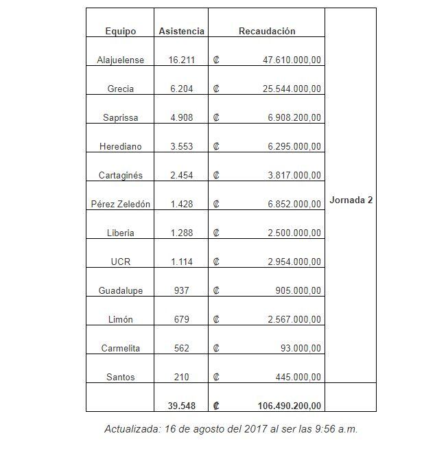 La Unafut publicó el informe de asistencia a los estadios de las primeras dos fechas del Apertura 2017 —aún no cuenta con el reporte de las siguientes jornadas— y Alajuelense es el equipo que más gente llevó a su primer partido como local, un dato que remarca su deuda con la afición.