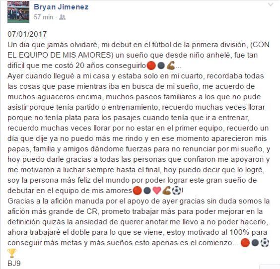 "Estoy contento, debuté con Alajuelense, el equipo de mis amores", afirmó el atacante, quien se lamentó por fallar en dos opciones claras de gol que tuvo.