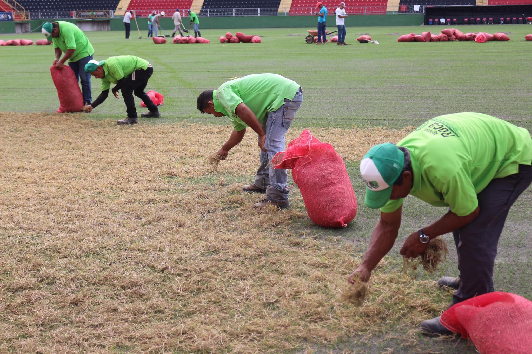 Entre este jueves y el viernes, los rojinegros cultivan las semillas de zacate bermuda sobre la malla sintética que se extendió el fin de semana anterior