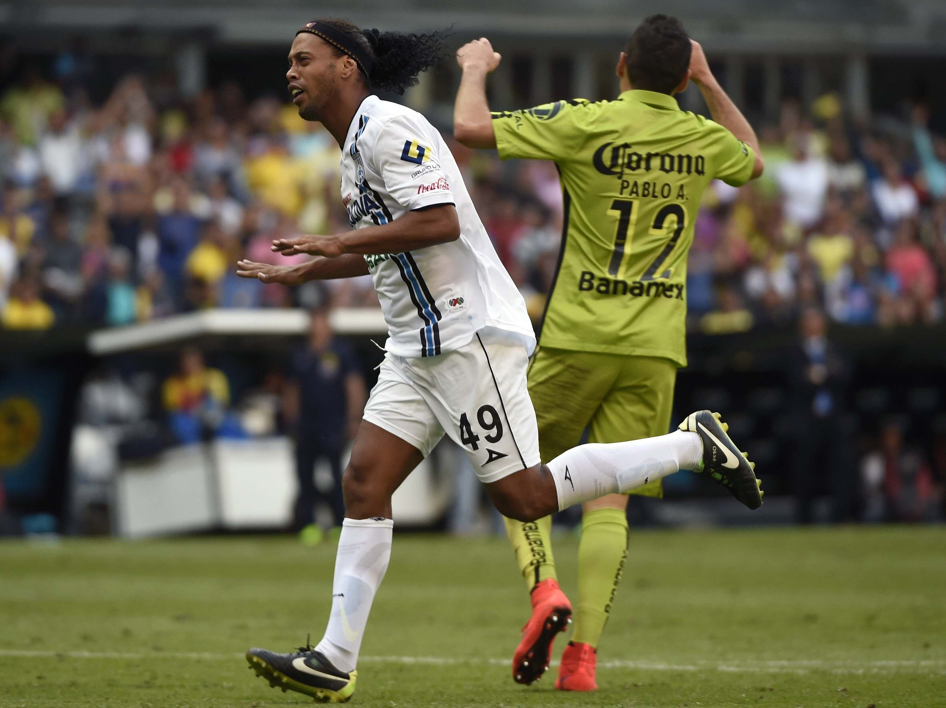 Ronaldinho corre a festejar uno de sus goles frente al América. (AFP)