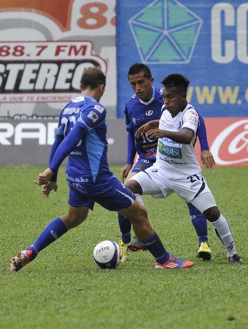 El lateral brumoso Yader Balladares (de blanco) intenta superar la marca del argentino Luciano Bostal, de Pérez Zeledón. | CARLOS GONZÁLEZ (CARLOS GONZALEZ CARBALLO)