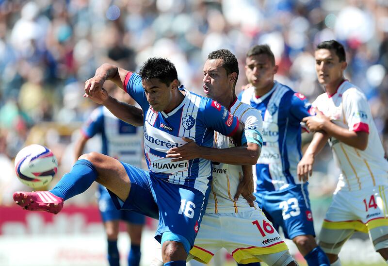 El volante brumoso, Carlos Hernández, sostiene el balón ante la dura marca del jugador belemita Carlos Acosta, ayer en el Fello Meza. | JOHN DURÁN. (JOHN DURAN)