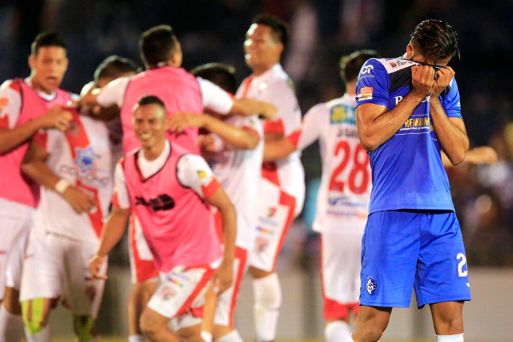El defensor brumoso Rándall Alvarado (derecha) se tapa la cara tras quedar eliminados en la última fecha del Torneo de Invierno, mientras que atrás los jugadores de Santos celebran la clasificación. | RAFAEL PACHECO (Rafael PACHECO GRANADOS)
