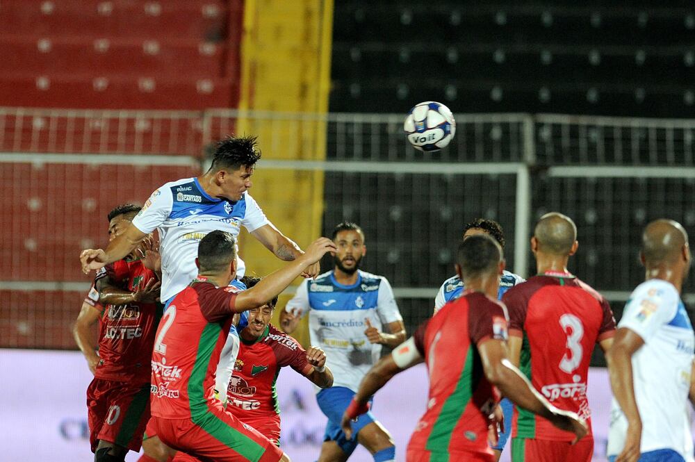 Kevin Fajardo (centro) aprovechó el descuido de la zaga de Carmelita para elevarse y de cabeza marcar el único tanto en la victoria de Cartaginés. | MELISSA FERNÁNDEZ (Melissa Fernandez Silva)