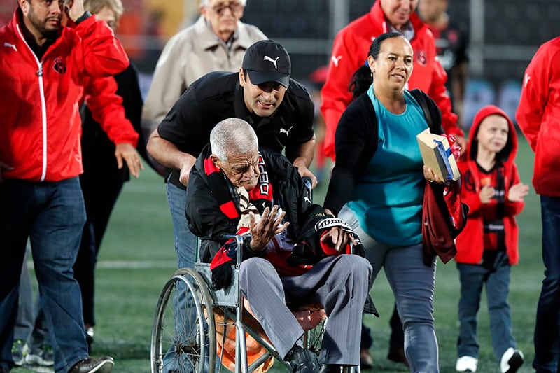 Ulloa, de 82 años, recibió un homenaje previo al juego en el que la Liga empató a un gol con San Carlos, en el estadio Alejandro Morera Soto.