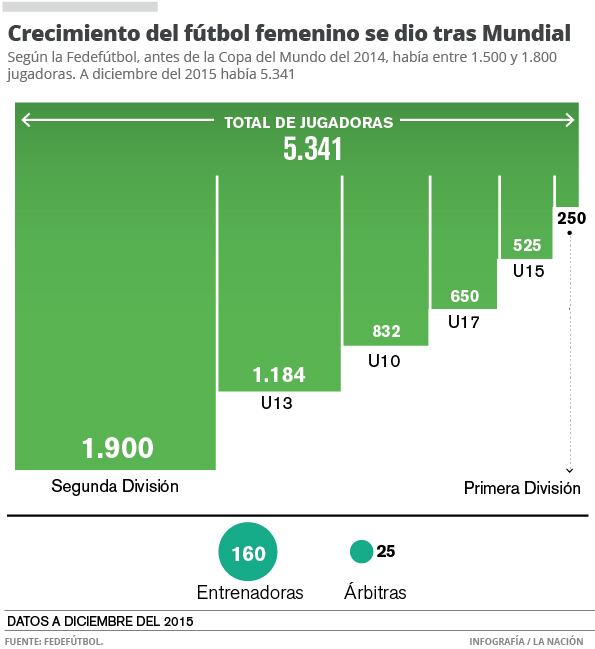 Según estimaciones de la Federación Costarricense de Fútbol (Fedefútbol), antes de la Copa del Mundo, el fútbol femenino tenía entre 1.500 y 1.800 mujeres inscritas en diferentes torneos. En el informe de diciembre del 2015 que envió el ente rector del fútbol tico a la FIFA, el dato era de 5.341 futbolistas afiliadas en las diferentes categorías.