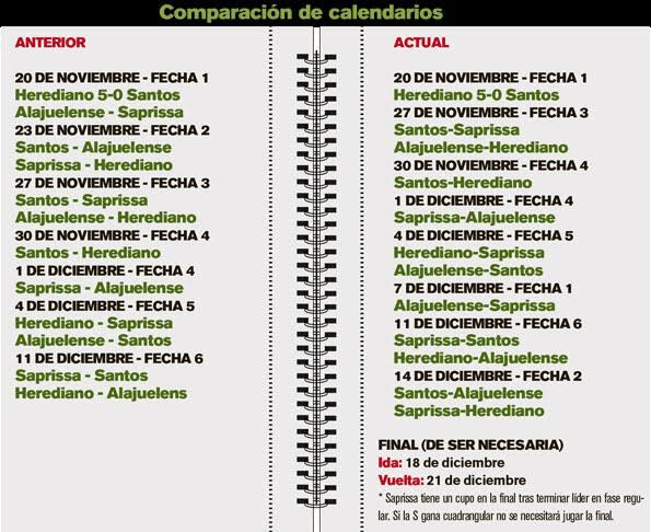 Los duelos Saprissa-Herediano y Santos-Alajuelense quedaron pactados para el próximo 14 de diciembre, lo que hizo que ahora todo el calendario del cierre del certamen se modificara, si se toma en cuenta que el clásico nacional tampoco pudo realizarse el domingo anterior, tras la trágica muerte de Gabriel Badilla, y se efectuará el 7 de diciembre.