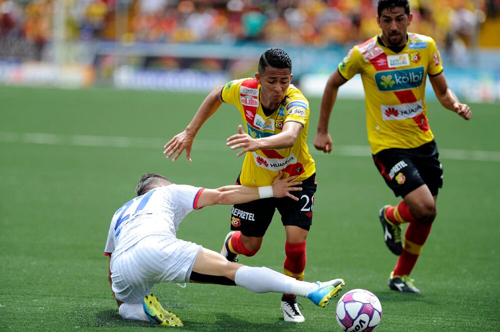 El volante de Herediano, Gerson Torres, maneja la pelota ante la marca del defensor de San Carlos, Javier Loaiza, en el juego que se llevó a cabo en un estadio Eladio Rosabal Cordero de Heredia. | DIANA MÉNDEZ (DIANA_MENDEZ.)