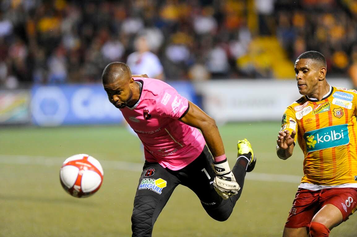 Patrick Pemberton protege el balón ante el intento de Kenny Cunnigham en el partido del miércoles entre Herediano y Alajuelense. (Luis Navarro)