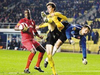El jugador de Sheriff de Moldavia, Erikhin Alexandr (centro), disputa el balón con el portero del Twente Sander Boschker (der.) y Douglas (izq). | EFE (STR)
