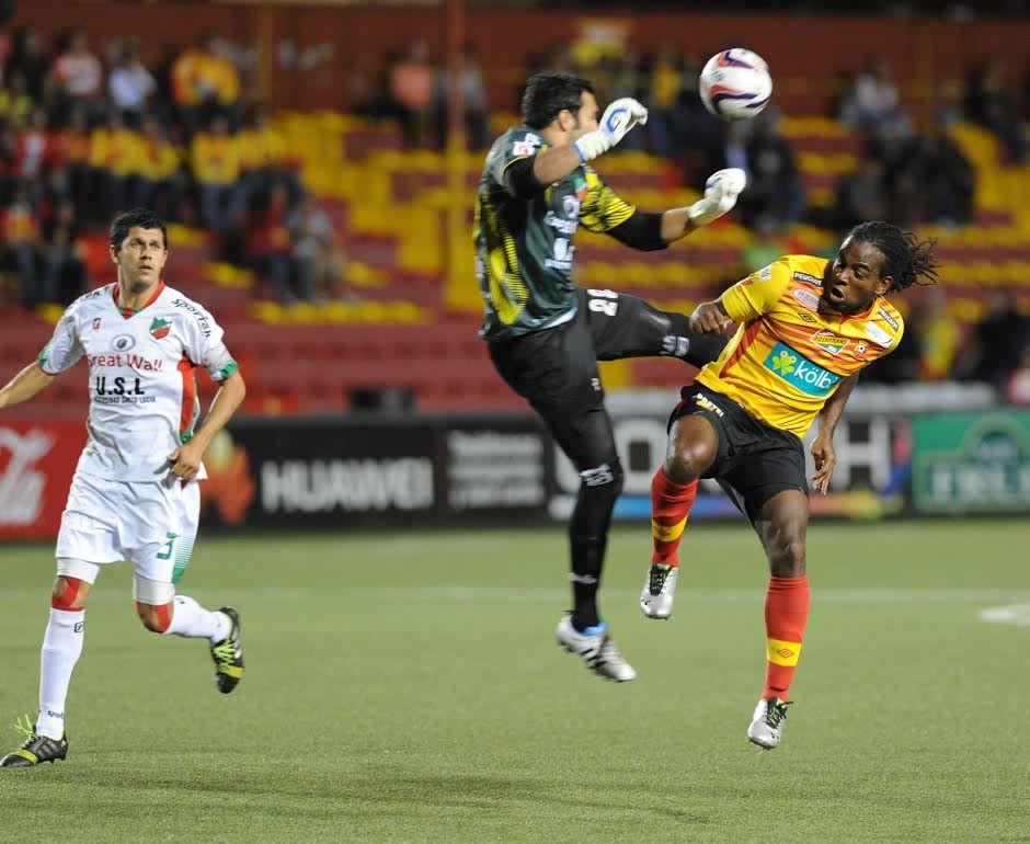 Víctor Núñez, delantero de Herediano, disputó este miércoles un balón con el portero de Carmelita, Marco Madrigal. (Manuel Vega)