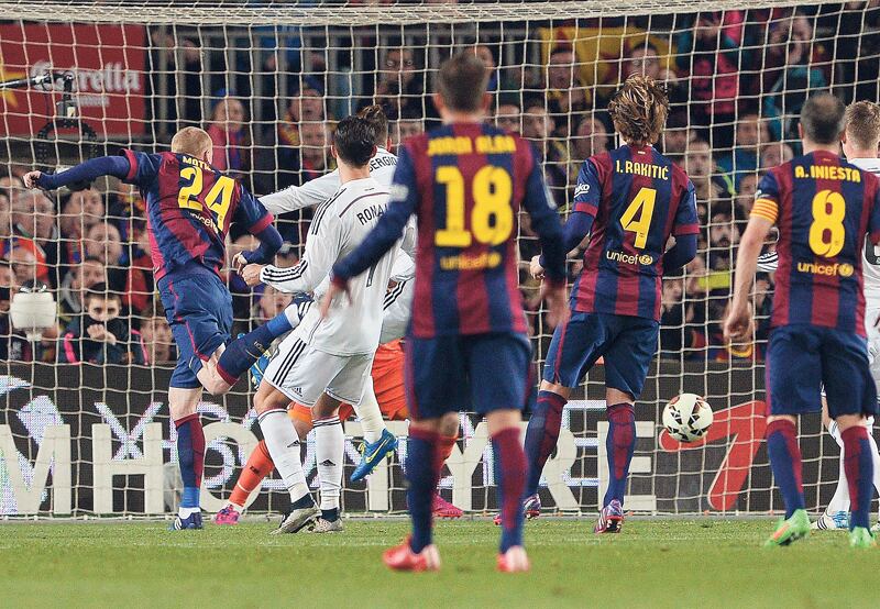 El equipo de la capital española fue superado por la divisa blaugrana que firmó el 1-0 con el cabezazo limpio de Jeremy Mathieu y que en el segundo tiempo se encargó de superar la zaga blanca armado con el desequilibrio de un Neymar errático en la definición, con Lionel Messi más orquestador que voraz y aferrado al olfato asesino de Suárez, responsable de enredarle la temporada a un Real que atiza sus dudas