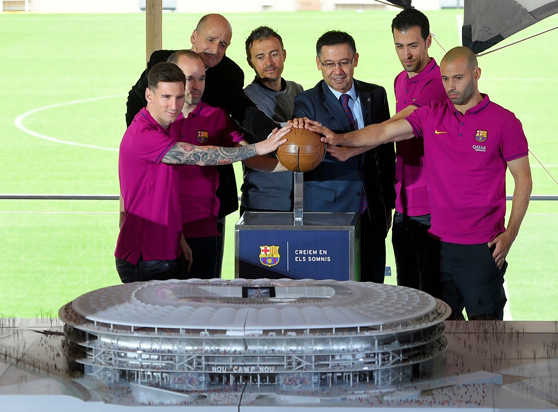 La maqueta del nuevo estadio ha salido a la luz después de que los cuatro capitanes del club (Andrés Iniesta, Sergio Busquets, Lionel Messi y Javier Mascherano), así como el entrenador (Luis Enrique) y el presidente (Josep Maria Bartomeu), junto al comisionado del Espai Barça (Jordi Moix), pulsasen un balón, que ha separado los cubículos y han dejado el proyecto de remodelación al descubierto.