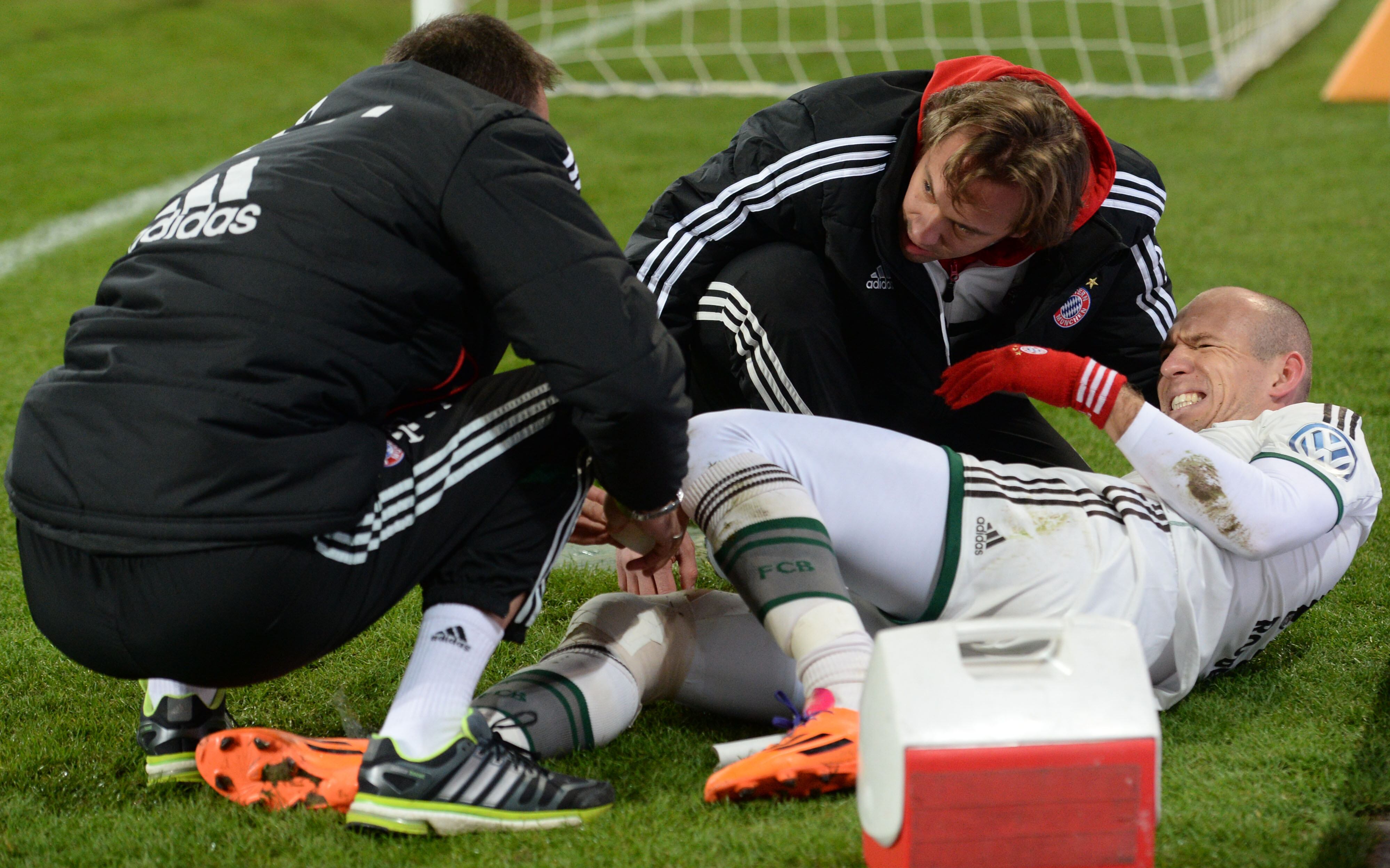 Arjen Robben, del Bayern Munich, sufrió una lesión en una jugada en el partido ante el Augsburg, durante los octavos de final de la Copa Alemania. (AFP)
