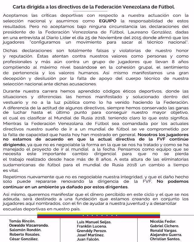 La misiva está firmada por Tomás Rincón, Oswaldo Vizcarrondo, Salomón Rondón, Roberto Rosales, César González, Luis Manuel Seijas, Franklin Lucena, Grenddy Perozo, Josef Martínez, Juan Falcón, Nicolás Fedor, Gabriel Cichero, Ronald Vargas, Alejandro Guerra y Christian Santos.