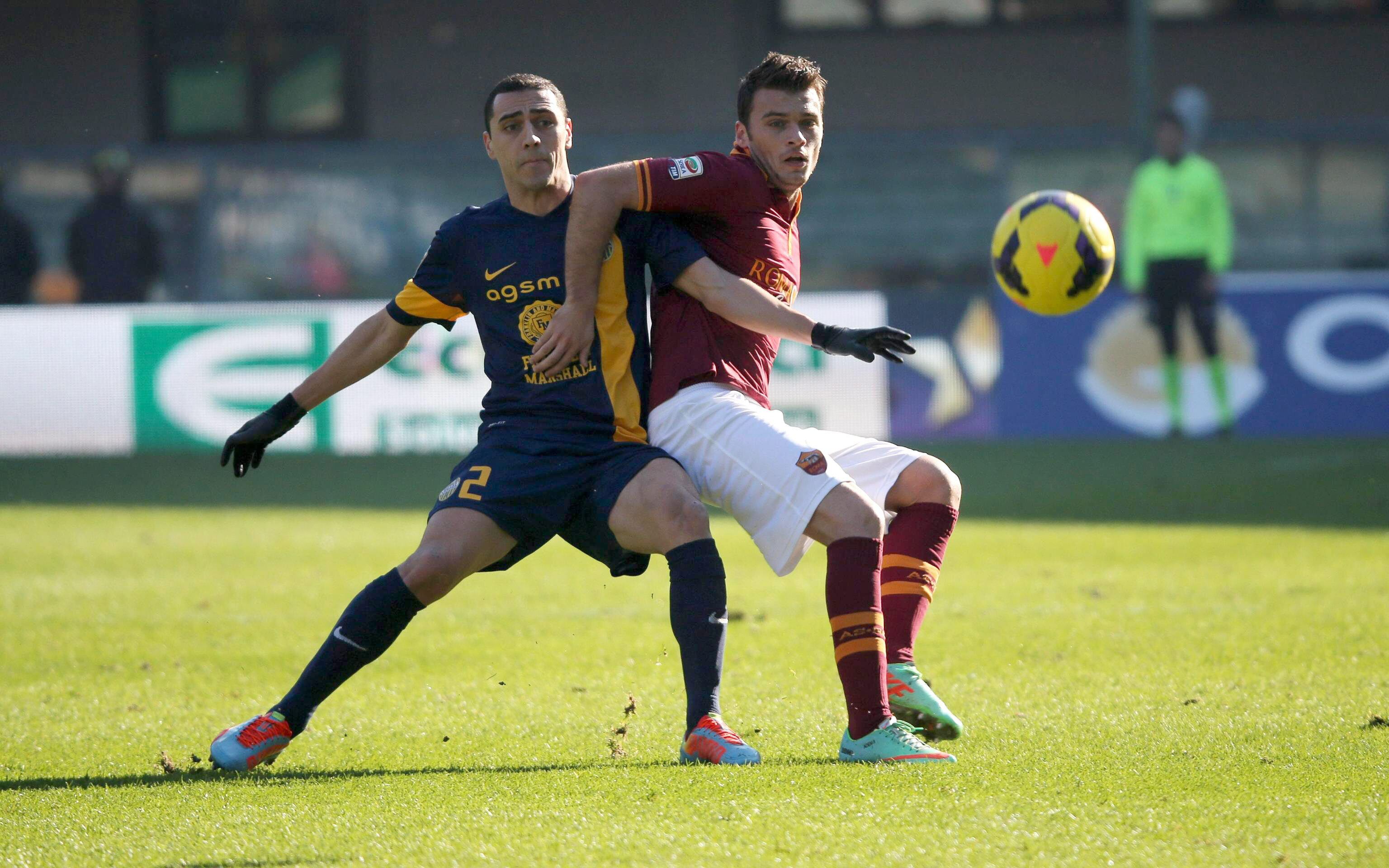 El brasileño Romulo Souza (2), volante del Hellas Verona, marca al serbio Adem Ljajic, delantero de Roma, durante el partido de este domingo que ganó el equipo capitalino, 1-3. (EFE)