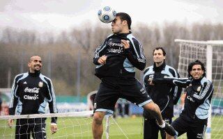 Nicolás Otamendi (centro) cabecea durante el entrenamiento de Argentina. Verón (izq.) y Tévez lo miran. | AFP (JUAN MABROMATA)