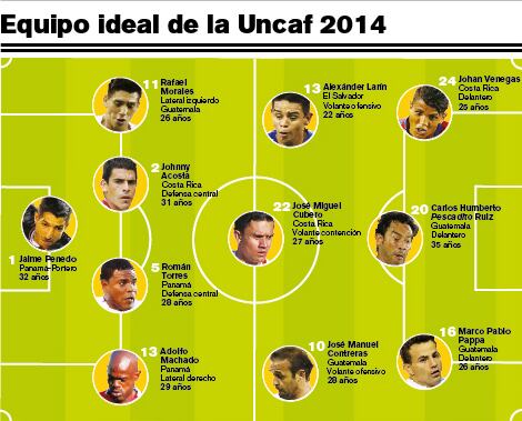 Igual tres panameños: el arquero Jaime Penedo, el lateral derecho del Saprissa, Adolfo Machado, y el central Román Torres, así como el volante salvadoreño del Herediano, el potente Alexander Larín.