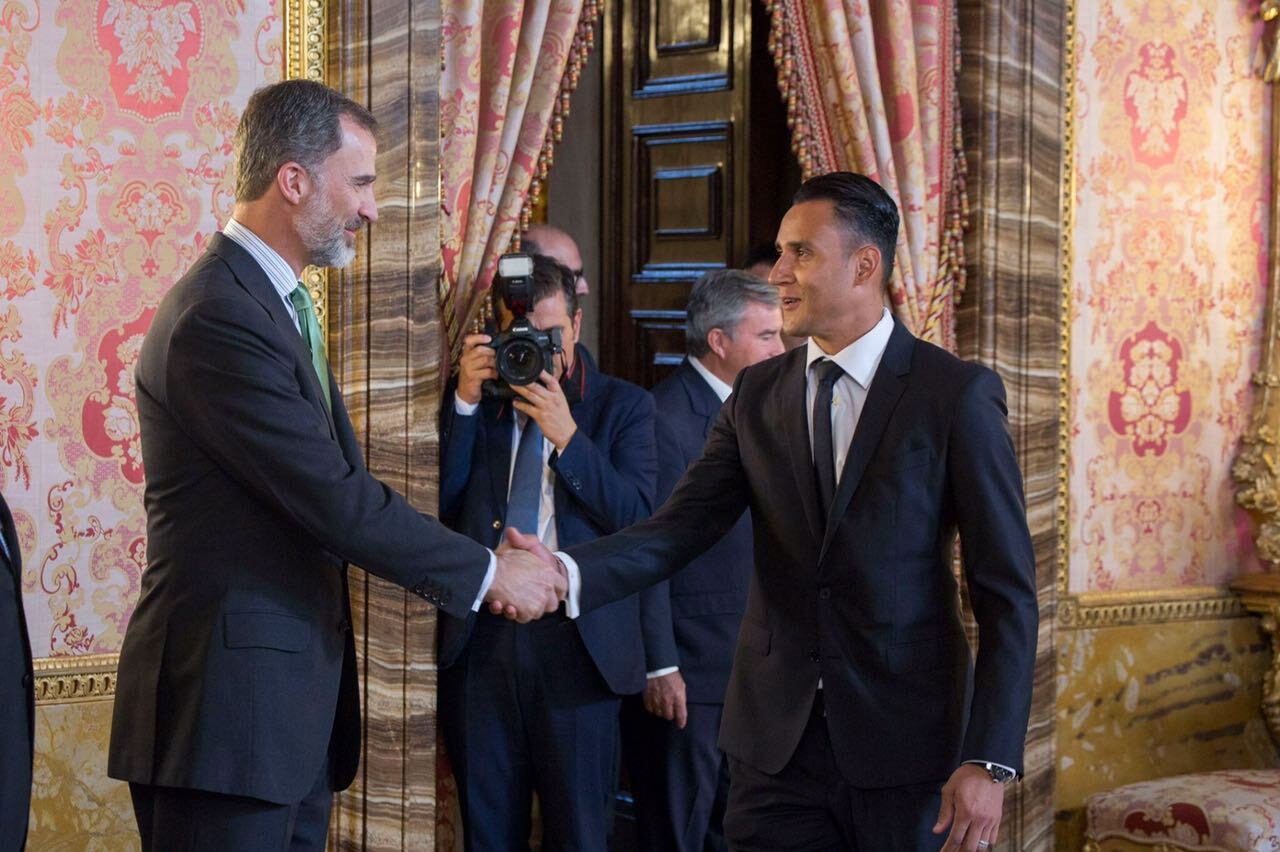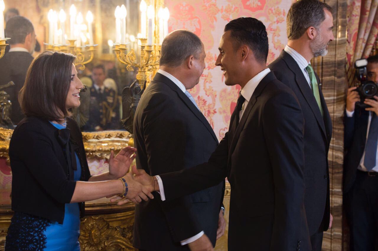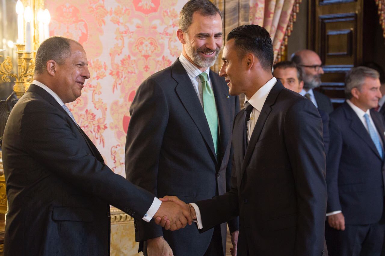 El portero costarricense Keylor Navas estuvo este lunes en el Palacio Real como invitado especial, durante la primera visita oficial a España del presidente Luis Guillermo Solís.