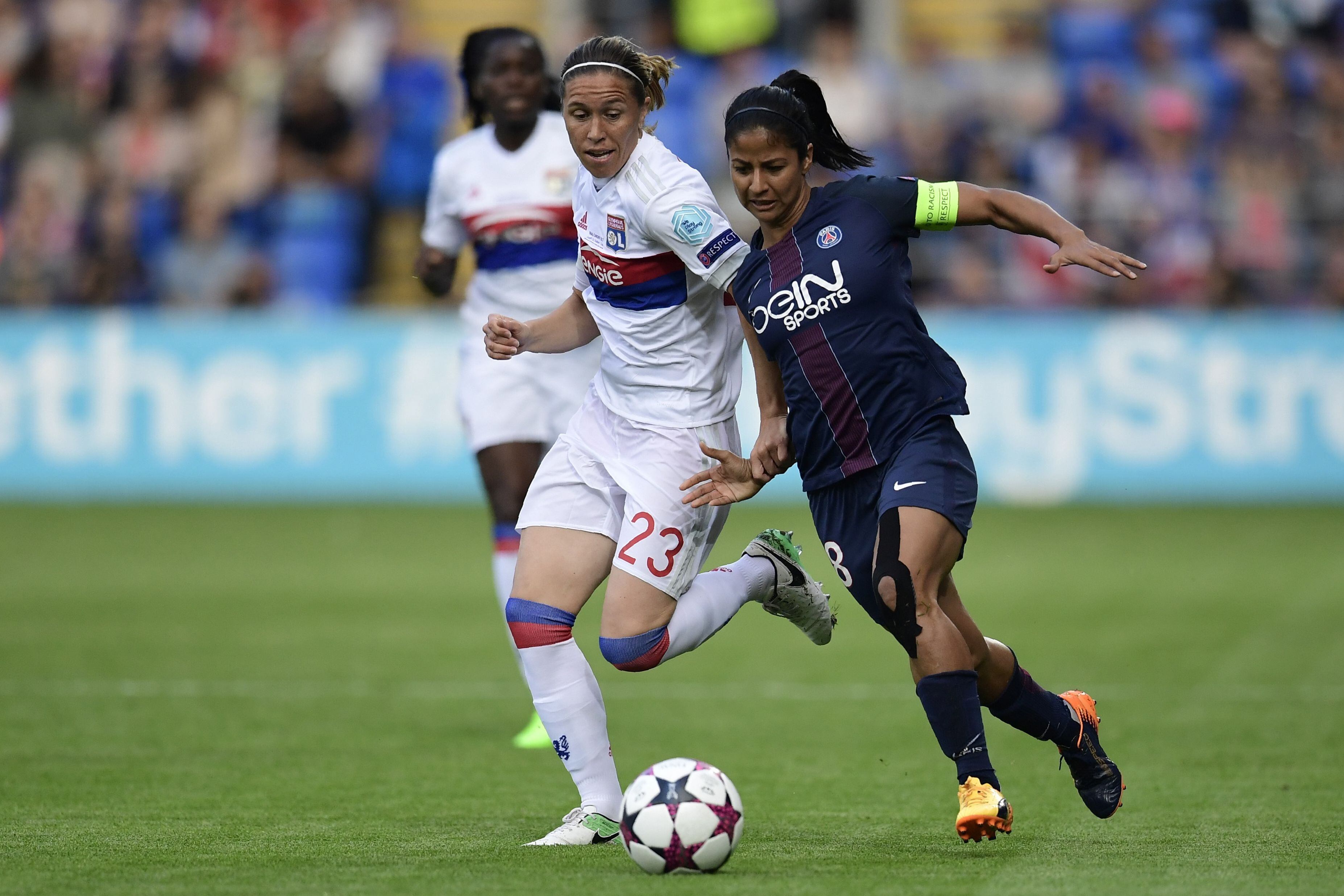 Shirley Cruz marca a la jugadora del Lyon, Abily. (AFP)